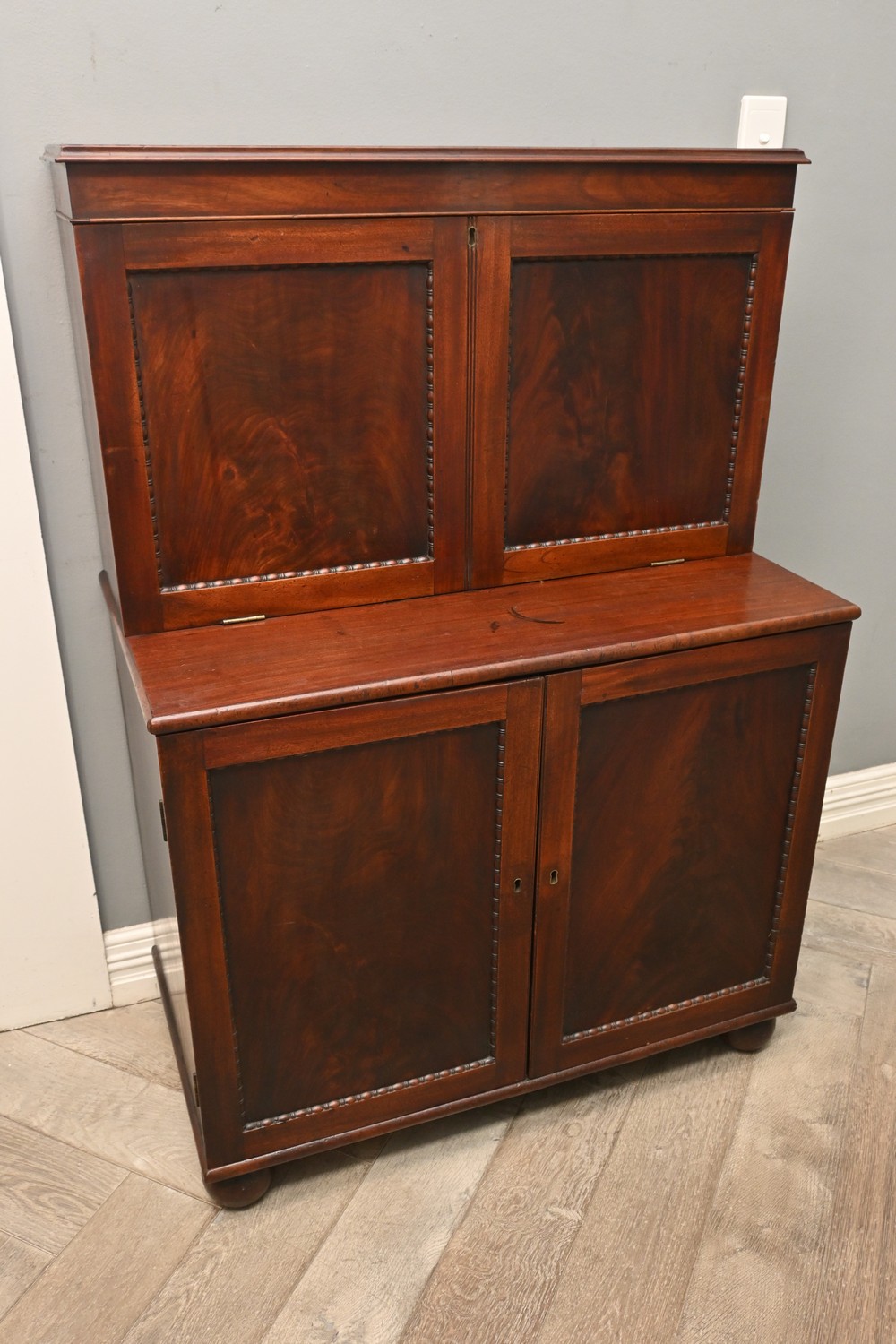 A REGENCY MAHOGANY FALL-FRONT WRITING CABINET, circa 1820 (KEY IN OFFICE) (A/F) (131H X 92W X 50D CM) (PLEASE NOTE THIS HEAVY ITEM MUST BE REMOVED BY CLIENTS OR CARRIERS AT THE CUSTOMERS EXPENSE. LEONARD JOEL STAFF CANNOT ASSIST CARRYING THIS ITEM)