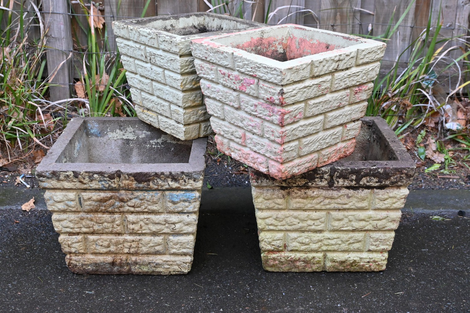 A COLLECTION OF FOUR BRICK FORM POTS (A/F) (34H X 42W X 42D CM) (PLEASE NOTE THIS HEAVY ITEM MUST BE REMOVED BY CLIENTS OR CARRIERS AT THE CUSTOMERS EXPENSE. LEONARD JOEL STAFF CANNOT ASSIST CARRYING THIS ITEM)