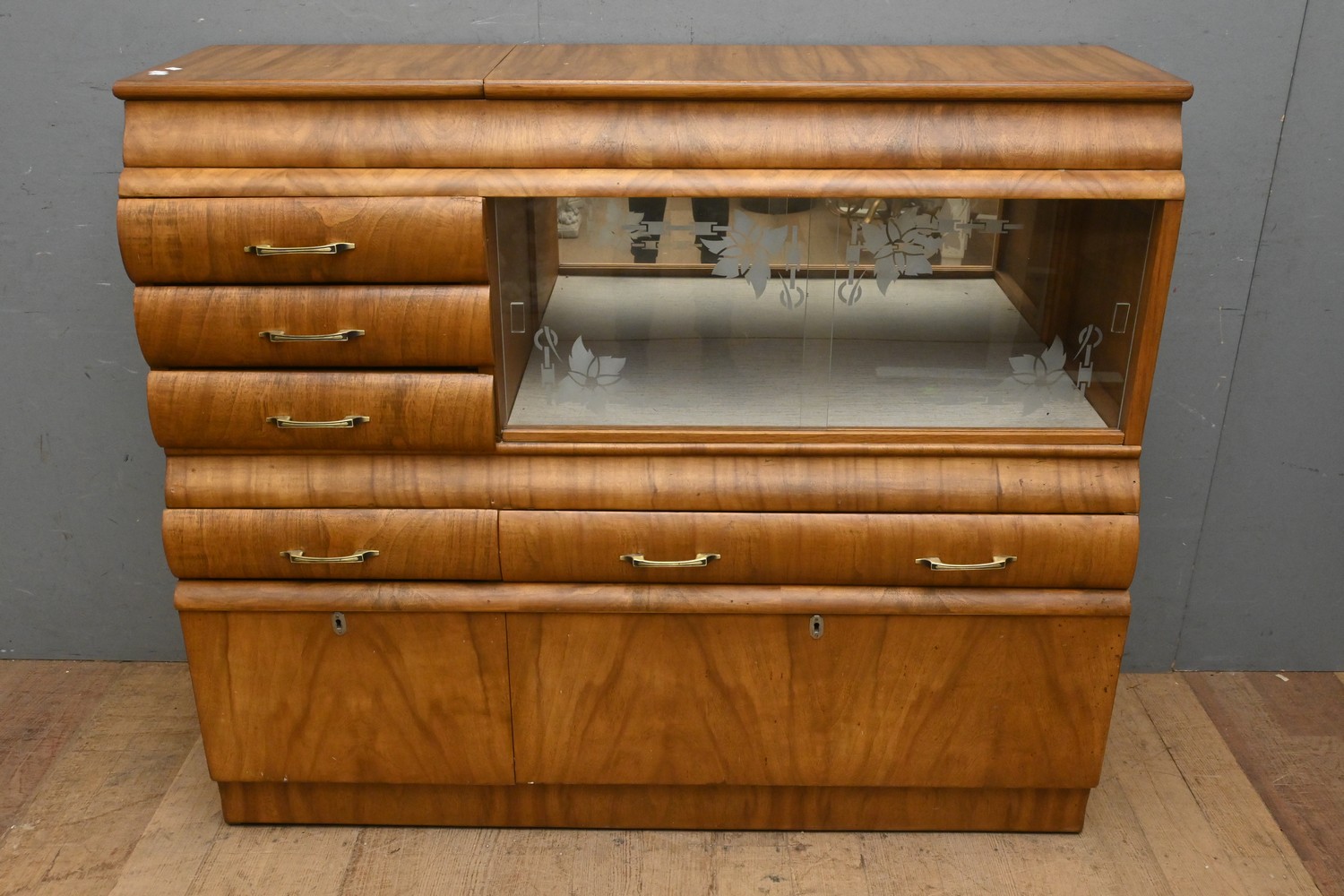 AN ART DECO GLASS FRONT CABINET (A/F) (H109 X W131 X D46 CM) (PLEASE NOTE THIS HEAVY ITEM MUST BE REMOVED BY CLIENTS OR CARRIERS AT THE CUSTOMERS EXPENSE. LEONARD JOEL STAFF CANNOT ASSIST CARRYING THIS ITEM)