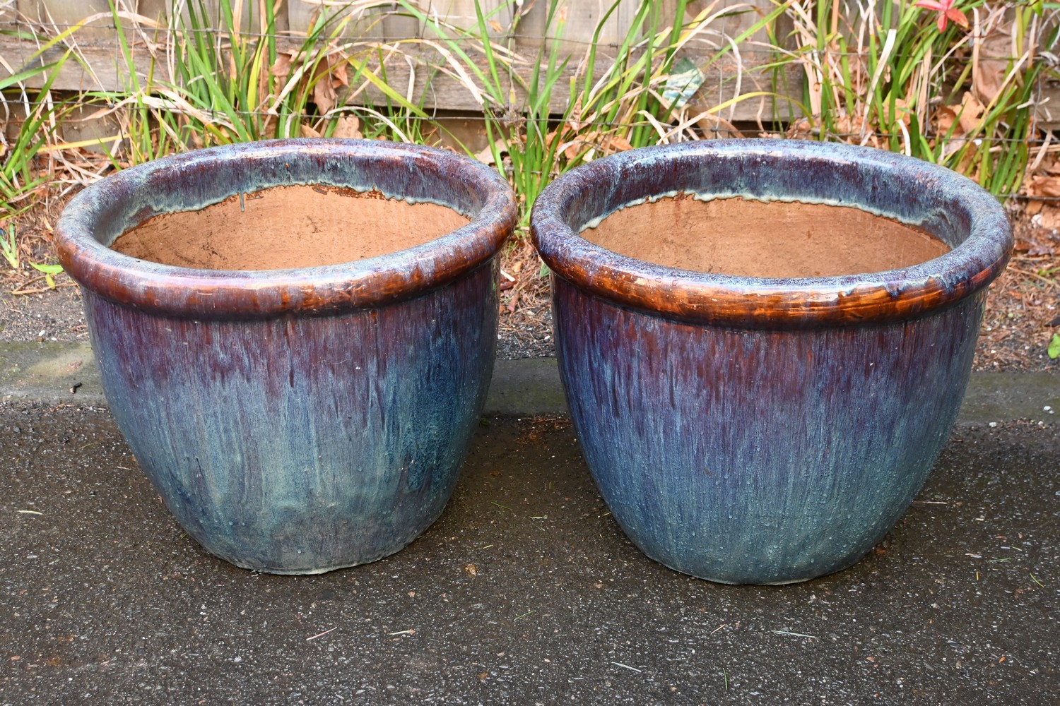 A PAIR OF GLAZED GARDEN POTS ( 40H X 50 DIAMETER CM) (LEONARD JOEL DELIVERY SIZE: LARGE)