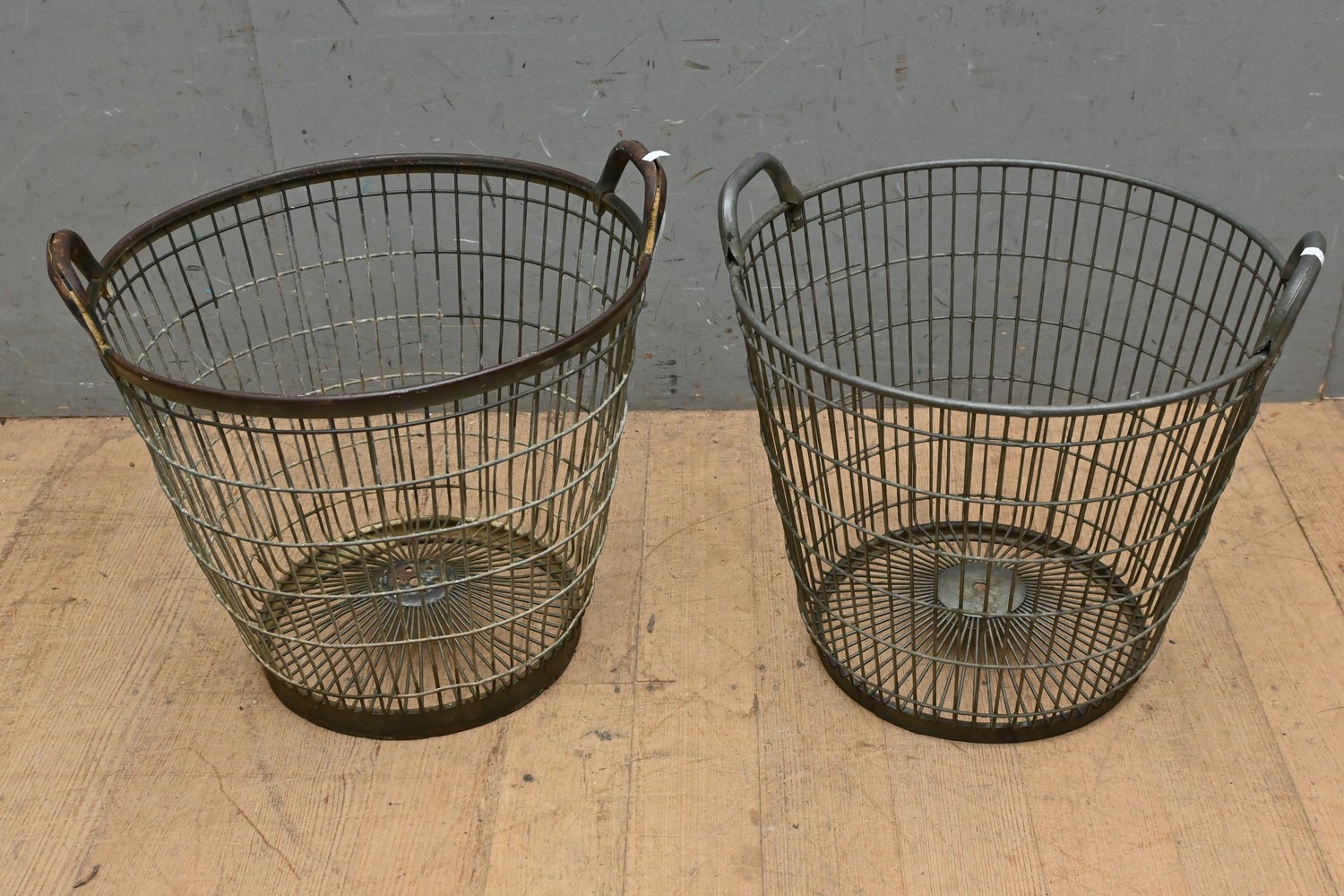 A PAIR OF FRENCH GALVANISED WIRE FORM HANDLED FRUIT BASKETS (43H X 47D CM) (LEONARD JOEL DELIVERY SIZE: LARGE)