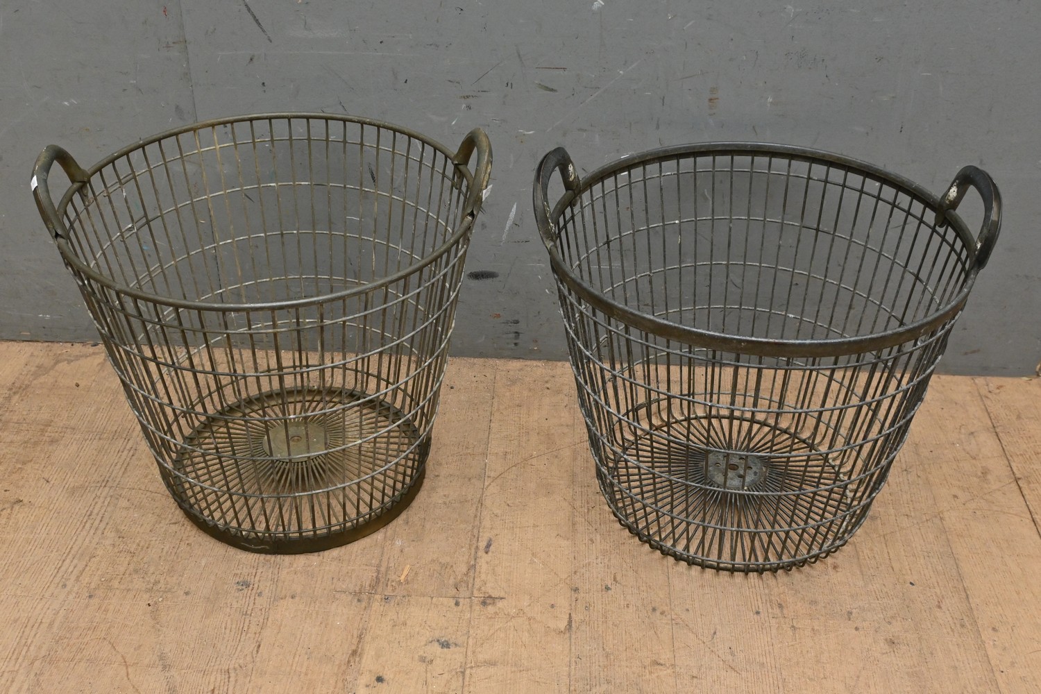 A PAIR OF FRENCH GALVANISED WIRE FORM HANDLED FRUIT BASKETS (42H X 48D CM) (LEONARD JOEL DELIVERY SIZE: LARGE)