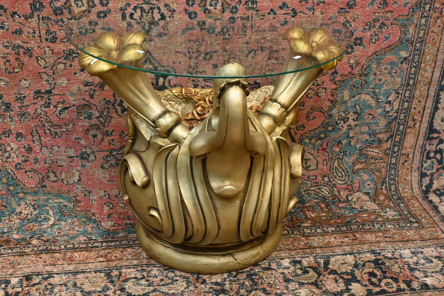 AN ITALIAN SILVERED AND GILT FLOWER FORM SIDE TABLE WITH GLASS TOP (A/F) (75H X 86W X 48D CM) (LEONARD JOEL DELIVERY SIZE: LARGE)
