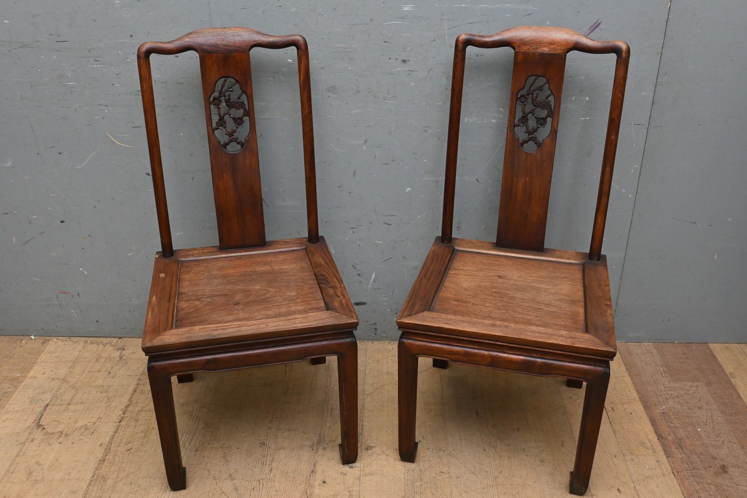 A PAIR OF CHINESE SOLID ROSEWOOD CHAIRS WITH CARVED FLORAL AND BIRD MOTIVES TO BACKREST (A/F) (H95 X W46 X D51 CM) (LEONARD JOEL DELIVERY SIZE: LARGE)