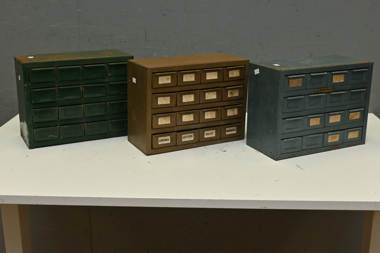 A GROUP OF THREE VINTAGE 16 DRAWER ROTA AUSTRALIAN METAL CABINETS (A/F) (23H X 30W X 14D CM) (LEONARD JOEL DELIVERY SIZE: LARGE)