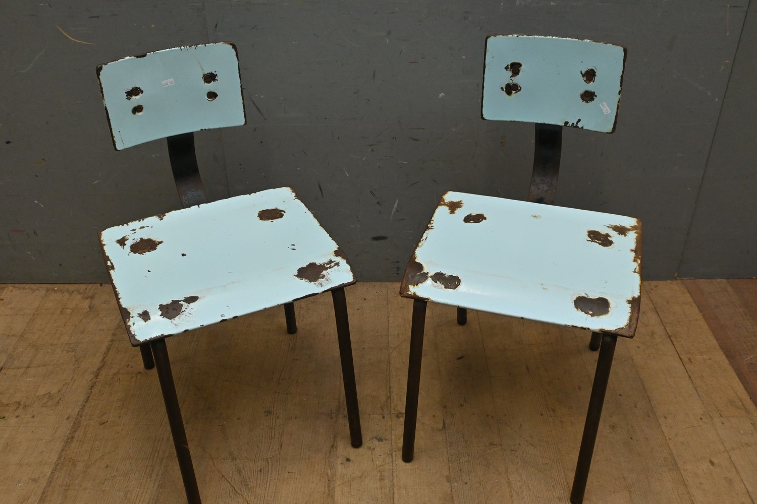 A PAIR OF FRENCH ENAMELLED AND STEEL CHILDREN'S CHAIRS (A/F) (70H X 40W X 43D CM) (LEONARD JOEL DELIVERY SIZE: LARGE)