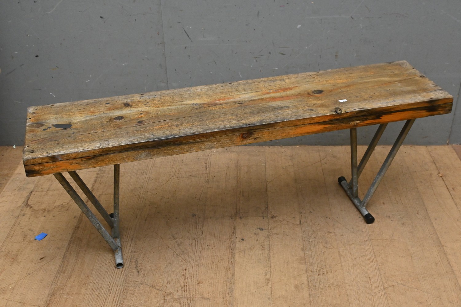 A WOODEN TOP FOLDING STEEL BASED BENCH (A/F) (45H X 121W X 29D CM) (LEONARD JOEL DELIVERY SIZE: LARGE)