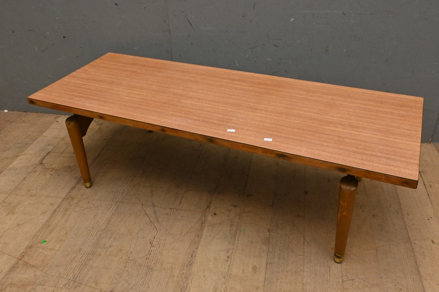 A 1970s WOOD COFFEE TABLE WITH LAMINEX TOP ( A/F) ( 36H X 122W X 46D CM) (LEONARD JOEL DELIVERY SIZE: LARGE)
