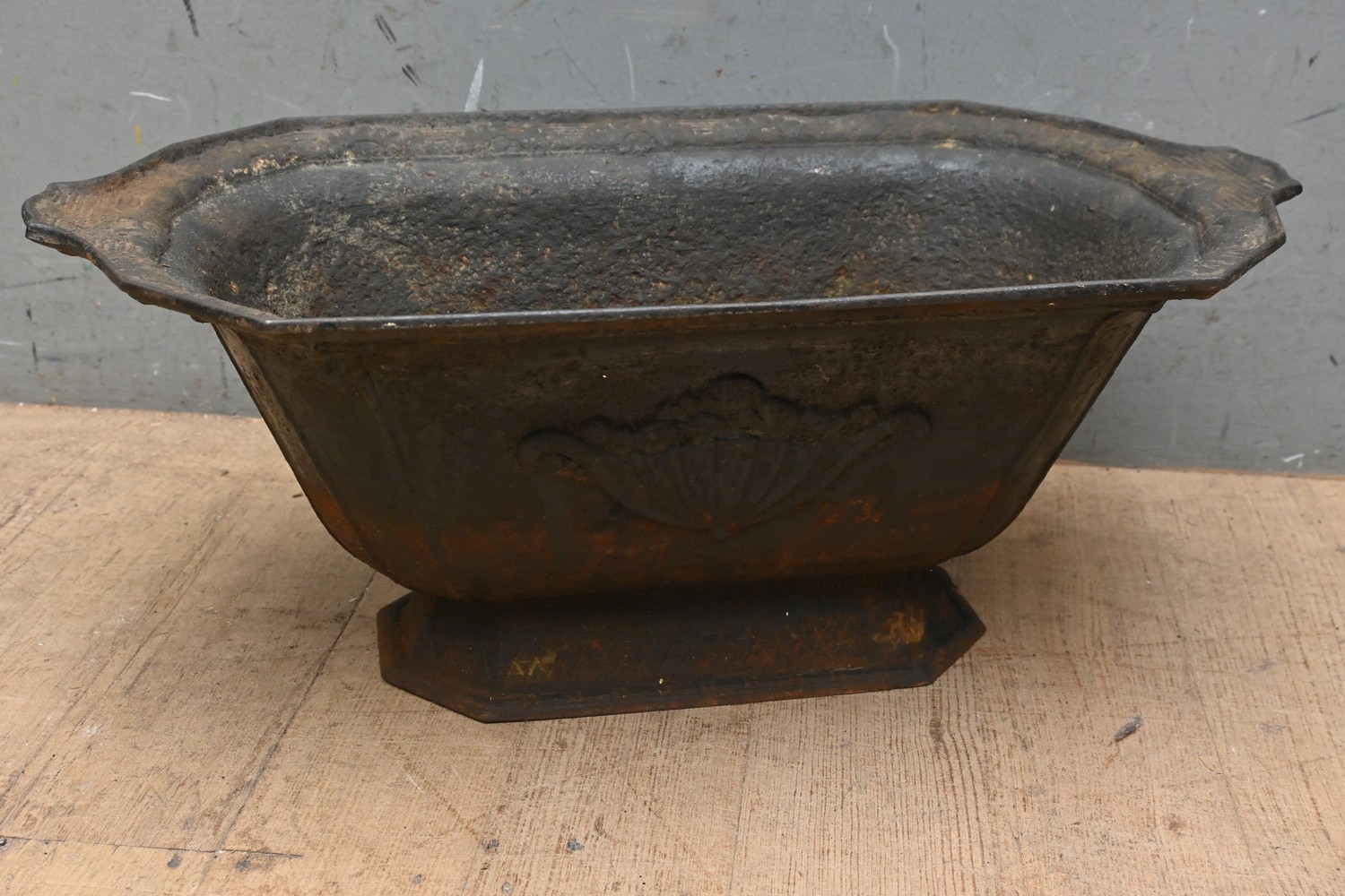 A 19TH CENTURY FRENCH CAST-IRON PLANTER WITH RAISED FLORAL AND FOLIAGE DECORATION TO SIDE (24H X 60W X 34D CM) (LEONARD JOEL DELIVERY SIZE: X-LARGE)