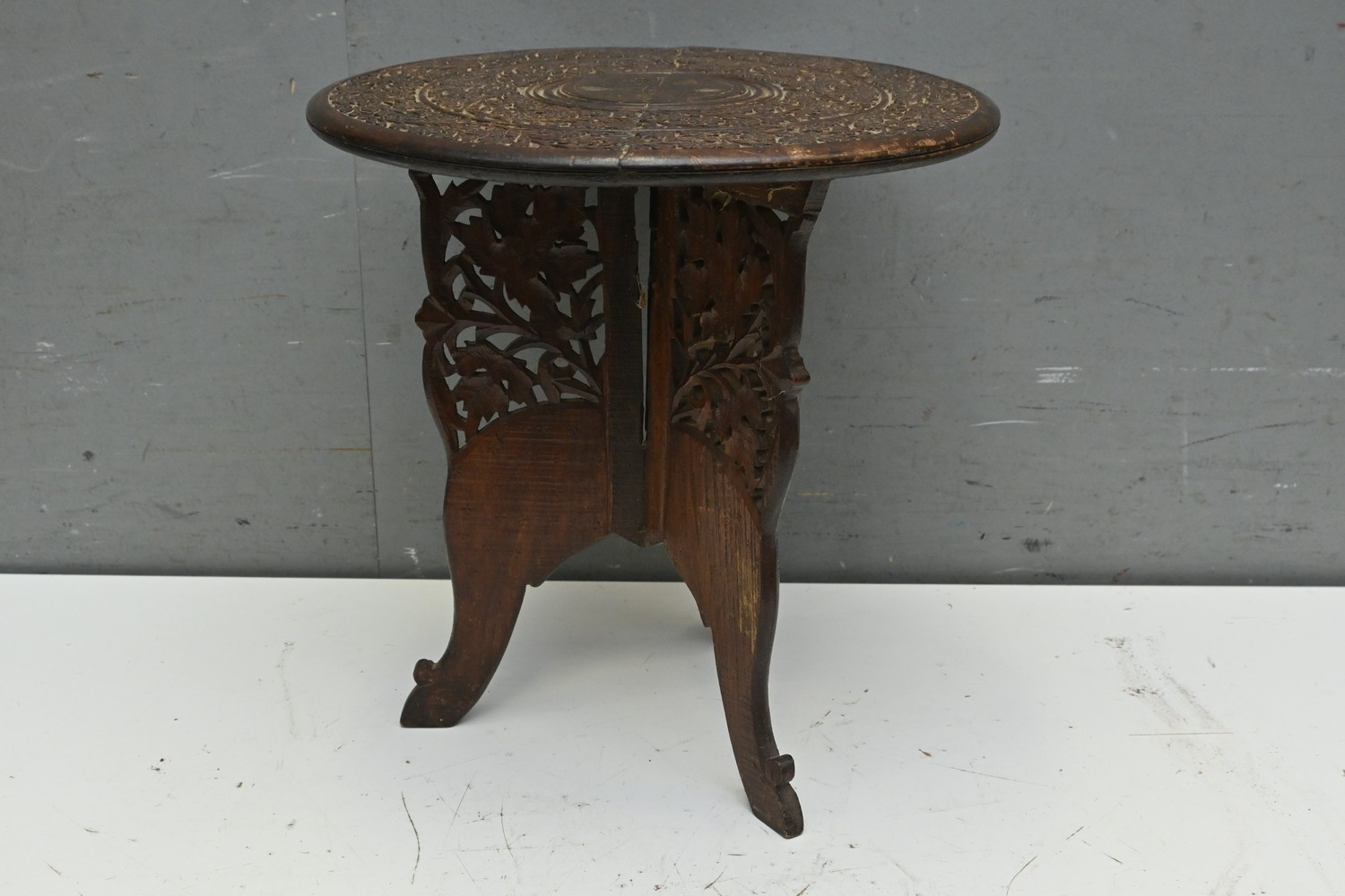 A CARVED INDIAN ROSEWOOD PADOUK THREE LEGGED TABLE (A/F) (H39 X D38 CM) (LEONARD JOEL DELIVERY SIZE: MEDIUM)