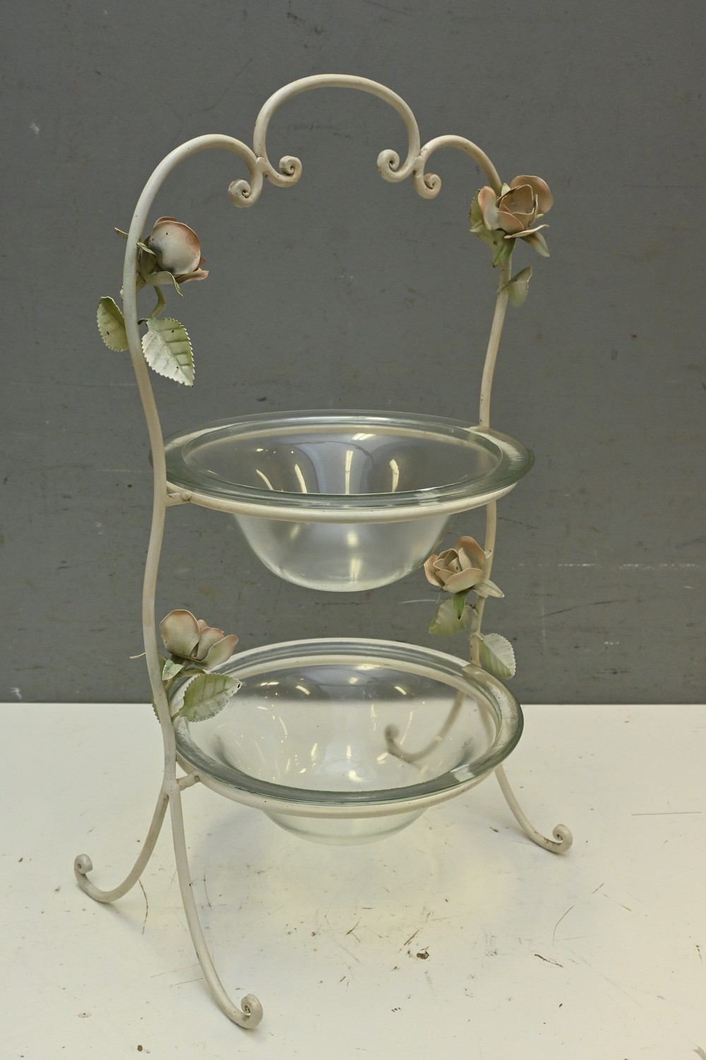 A VINTAGE STEEL FRAMED TWO TIER STAND WITH ORIGINAL GLASS BOWLS AND APPLIED ROSE DETAILS ( 61H CM) (LEONARD JOEL DELIVERY SIZE: MEDIUM)