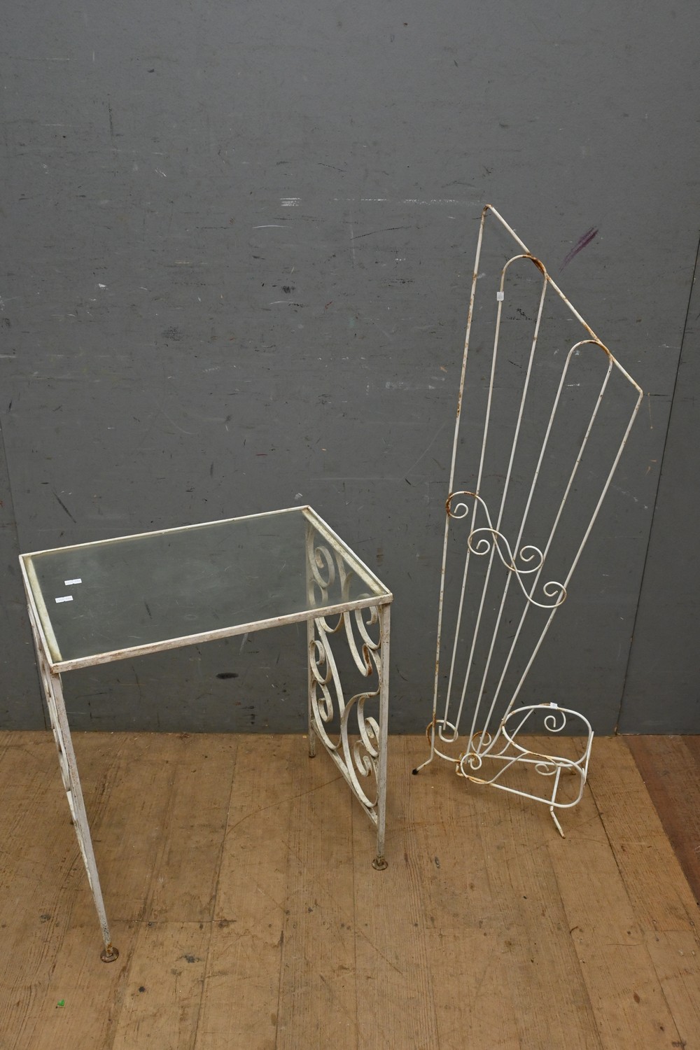TWO MID CENTURY WHITE WROUGHT IRON AND STEEL ITEMS INCLUDING GLASS TOP TABLE AND PLANT STAND (51H X 46W X 32D CM) (LEONARD JOEL DELIVERY SIZE: MEDIUM)