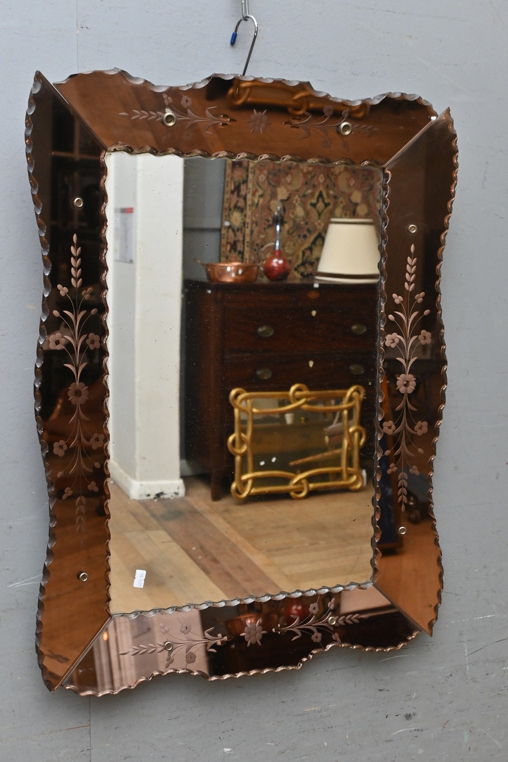 A FRENCH ART DECO PEACH COLOURED MIRROR WITH ETCHED GLASS ( A/F) ( 78H X 58W CM) (LEONARD JOEL DELIVERY SIZE: LARGE)