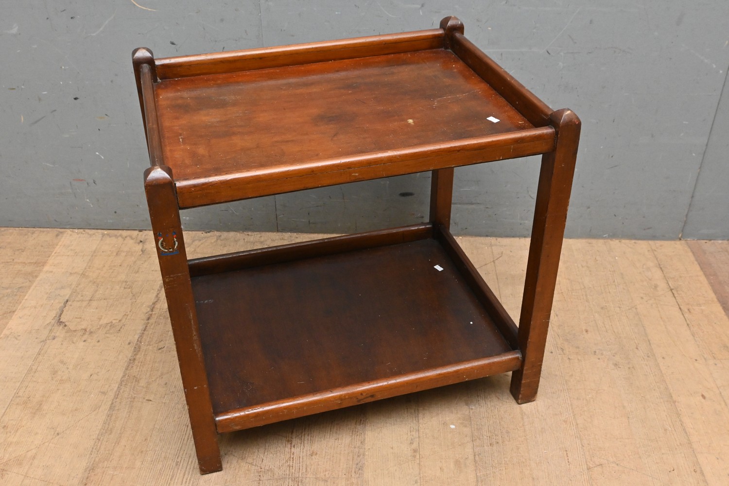 A 1940S DECO TWO TIER WOODEN AUTO TROLLEY - NO WHEELS (A/F) (H67 X W70 X D55 CM) (LEONARD JOEL DELIVERY SIZE: LARGE)