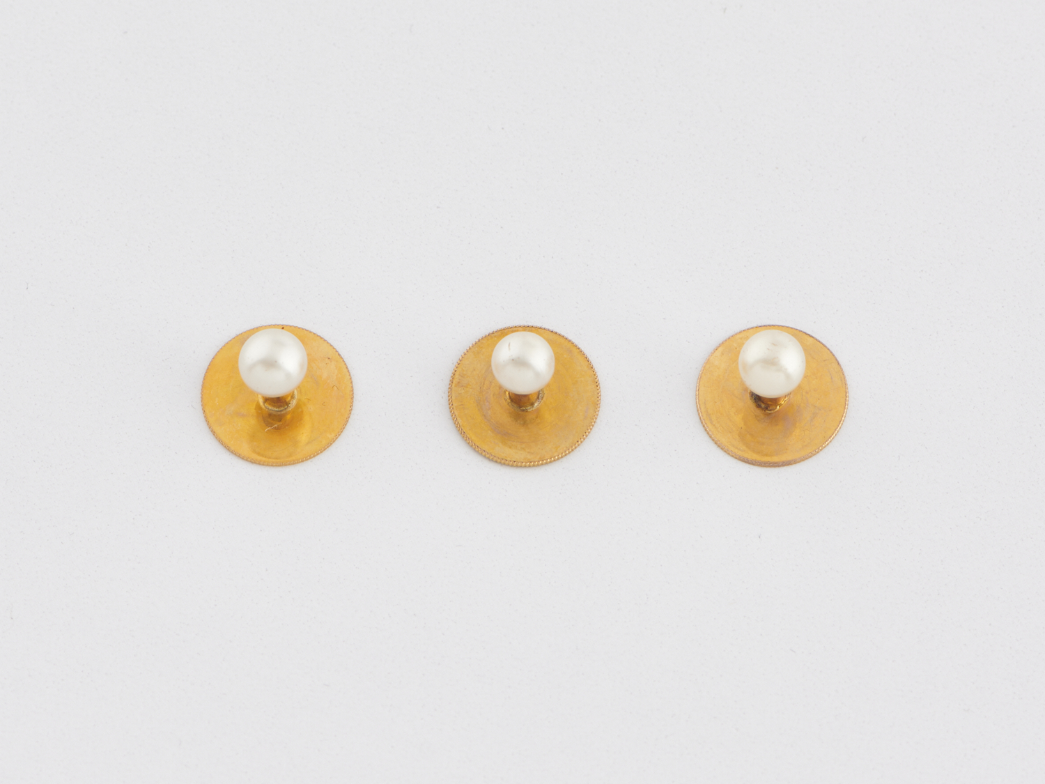 A COLLECTION OF THREE PEARL SET SHIRT STUDS IN 9CT GOLD, APPROXIMATE WEIGHT 2.39GMS
