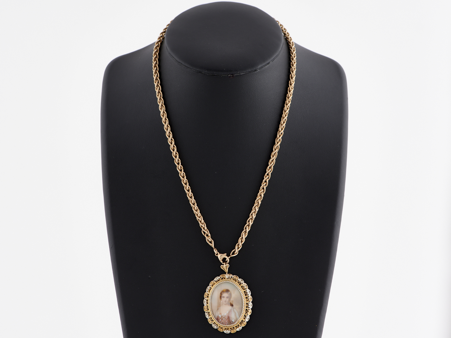A FRENCH SILVER GILT CHAIN TO A SILVER GILT PORTRAIT MINIATURE PENDANT, PENDANT 40 X 34MM