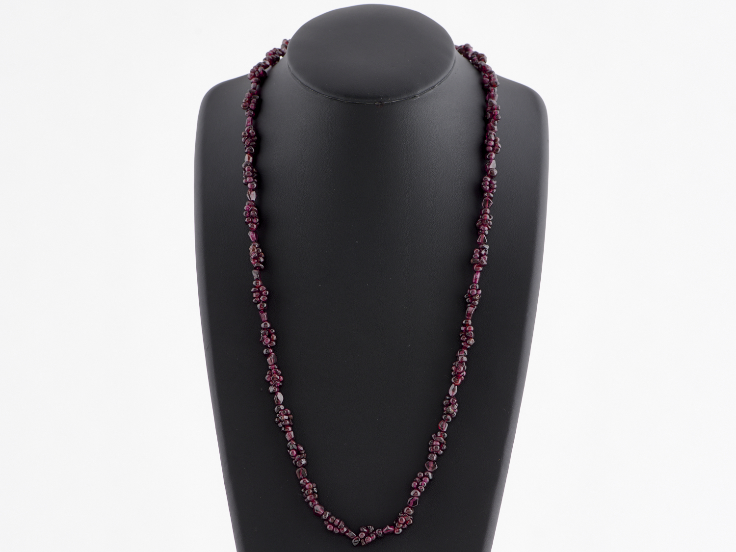 A VINTAGE STRAND OF TUMBLED GARNET BEADS TO A SCREW CLASP, LENGTH 700MM
