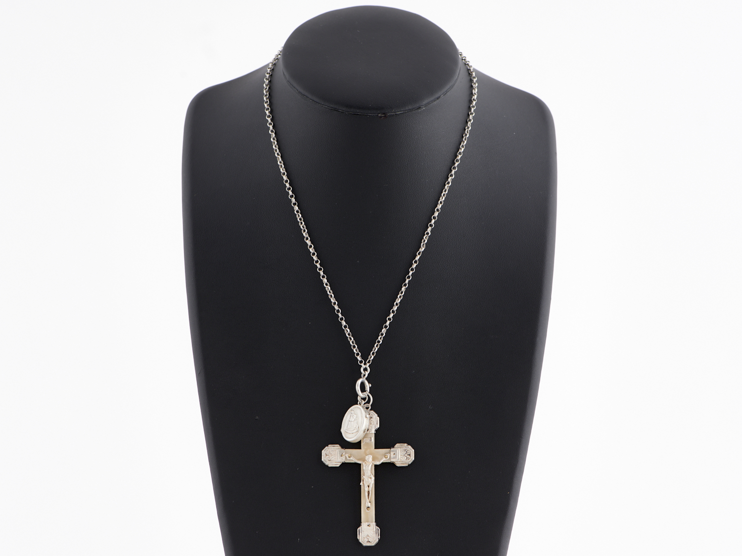 A FRENCH GUARD CHAIN IN SILVER, TO A CRUCIFIX AND LOCKET, WITH MARK TO CLASP, THE CRUCIFIX MEASURING 60 X 40MM