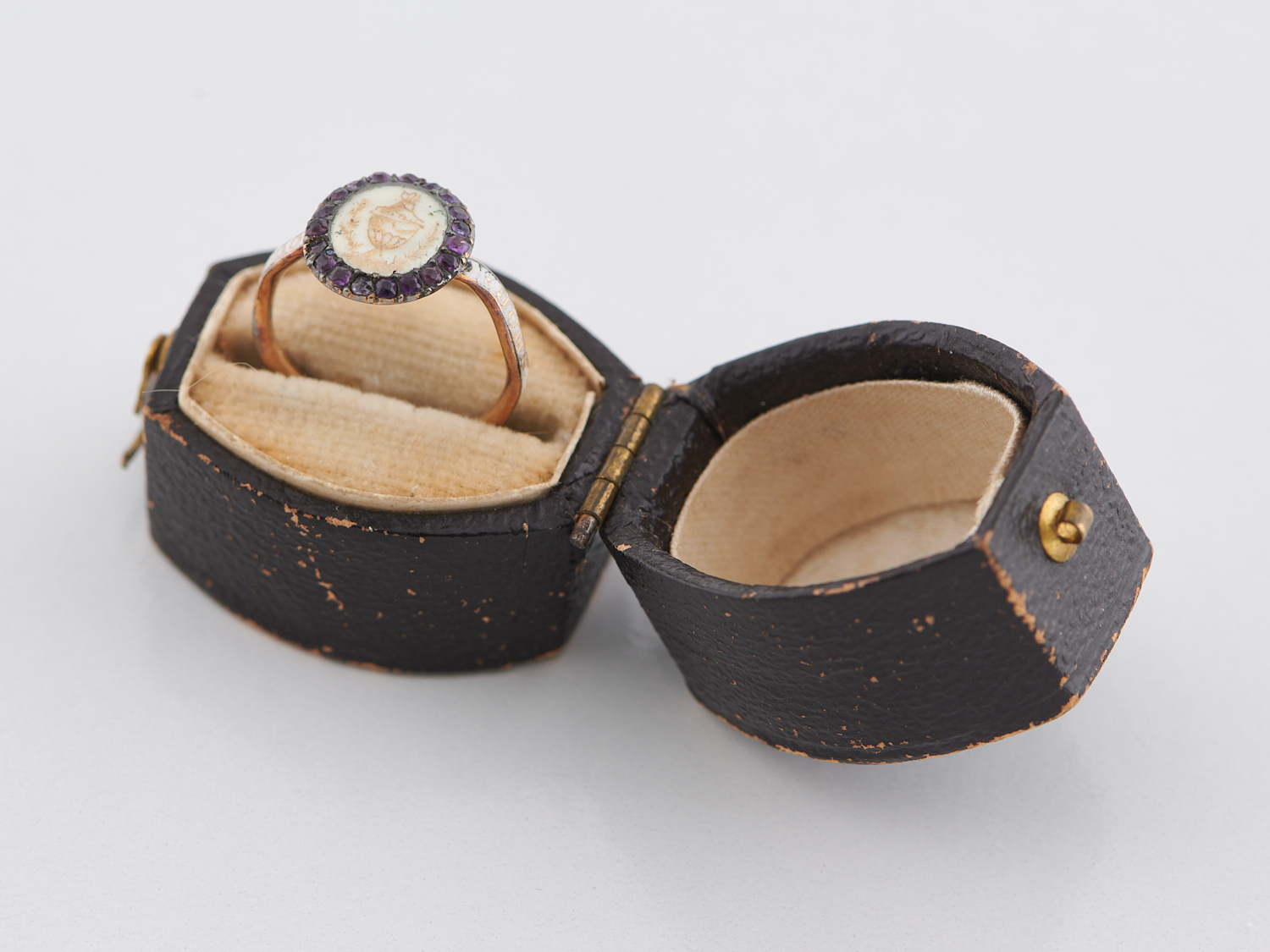 AN ENAMEL AND STONE SET GEORGIAN MOURNING RING, THE BAND INSCRIBED 'IN MEMORY OF JOHN CLOUGH 1770, AGED 10', ACCCOMPANIED BY A FITTED PERIOD BOX, SIZE F