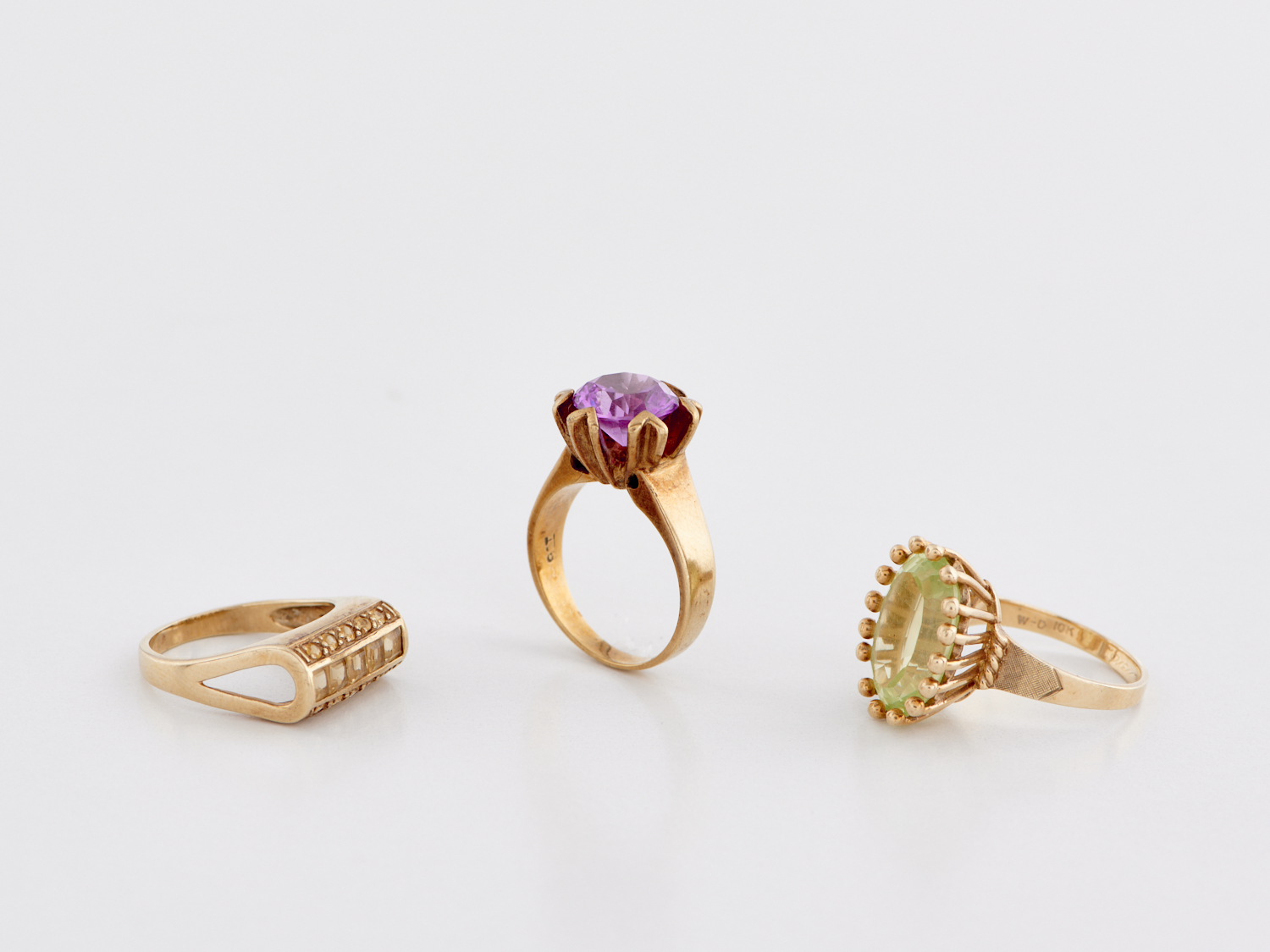 TWO VINTAGE RINGS IN 9CT GOLD (11.7GMS) AND ONE IN 10CT GOLD (6.4GMS), ONE SYNTHETIC PURPLE STONE (SIZE O), ONE SET WITH CITRINE (SIZE N), ONE SYNTHETIC GREEN STONE (SIZE N-O)