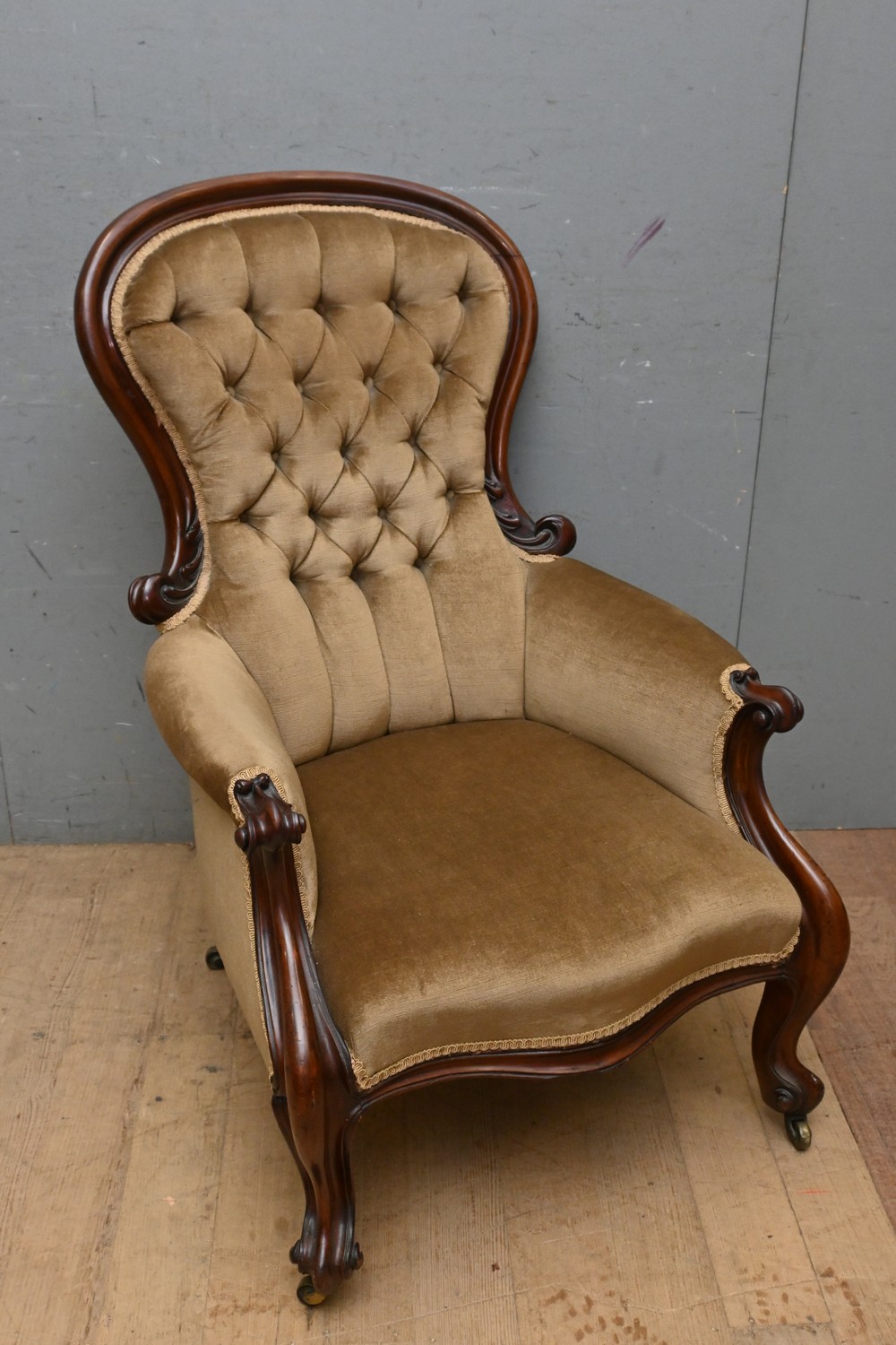 A VICTORIAN WALNUT AND UPHOLSTERED ARMCHAIR (A/F) ( 102H X 68W X 85D CM) (LEONARD JOEL DELIVERY SIZE: LARGE)