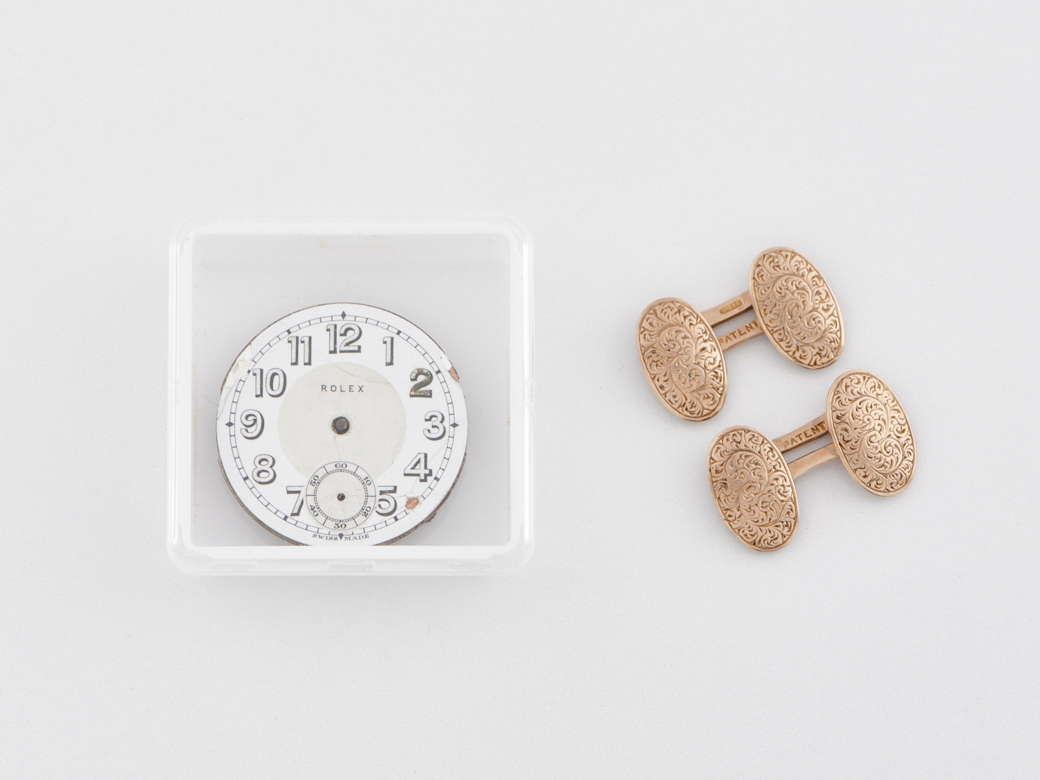 A ROLEX ENAMEL WATCH MOVEMENT TOGETHER WITH A PAIR OF ANTIQUE CUFFLINKS IN 9CT GOLD, CUFFLINKS 6.7GMS