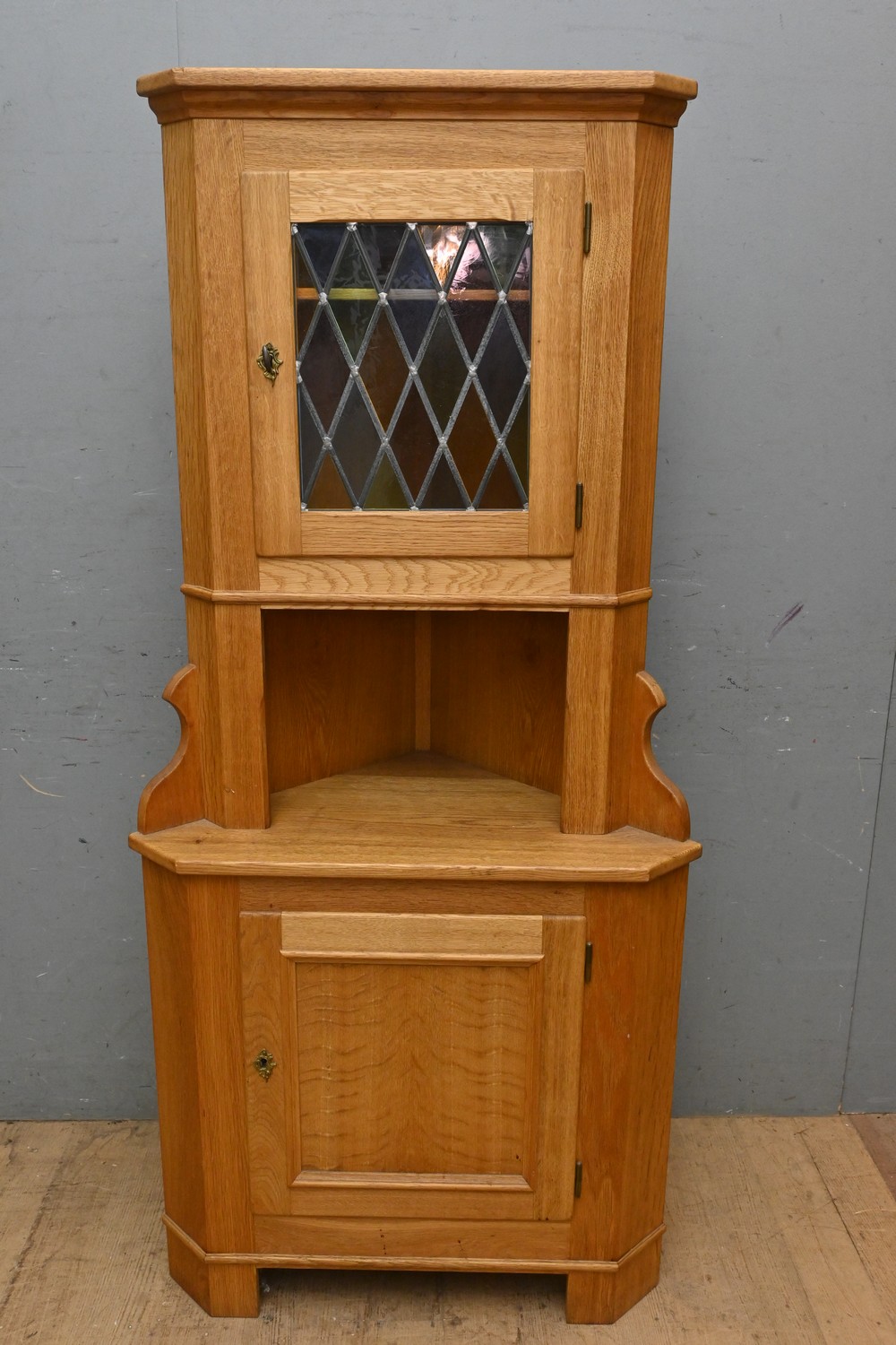 A DANISH OAK CORNER CABINET WITH GLAZED PANELS (A/F) (KEY IN OFFICE) ( 165H X 76W X 50D CM) (LEONARD JOEL DELIVERY SIZE: X-LARGE)