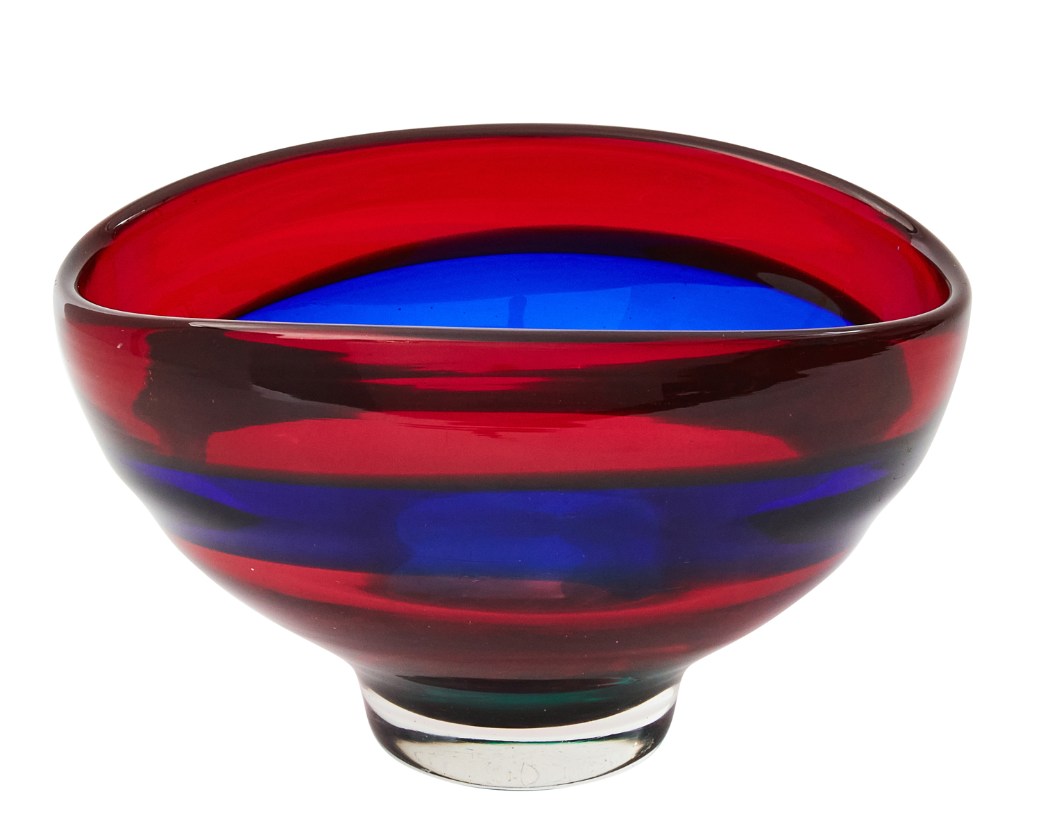 c. 1960s, for Mazzega I.V.R., the footed oval bowl decorated in fasce orizzontali of red, blue and green.
