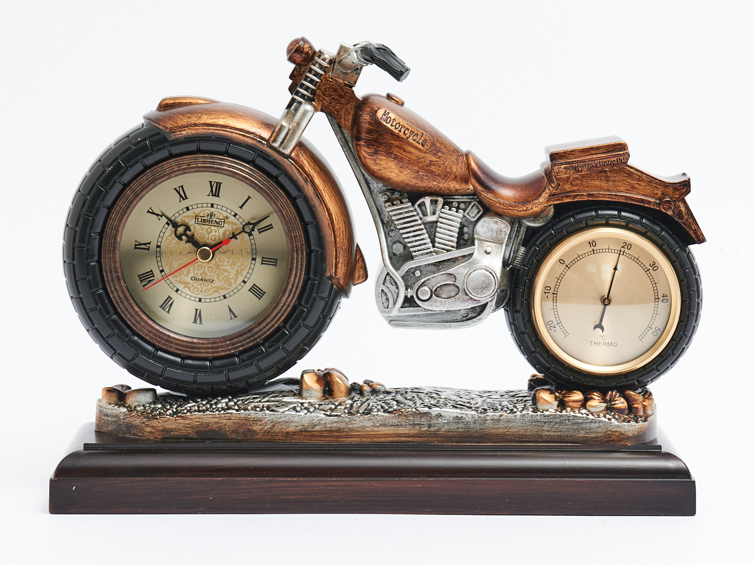 A LISHENG CLOCK AND THERMOMETER IN A FORM OF A MOTOCYCLE H.22CM X W.29CM, LEONARD JOEL LOCAL DELIVERY: SMALL