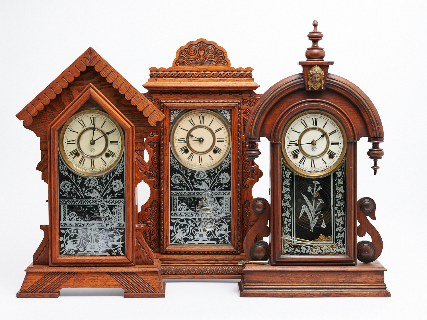 A GROUP OF THREE WOODEN CASED ANSONIA CLOCKS H.63CM (TALLEST), LEONARD JOEL LOCAL DELIVERY: MEDIUM
