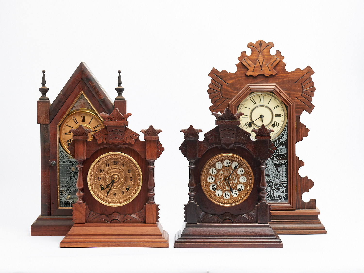 A GROUP OF FOUR WOODEN CASED CLOCKS INCLUDING ANSONIA H.58CM (LARGEST), LEONARD JOEL LOCAL DELIVERY: MEDIUM