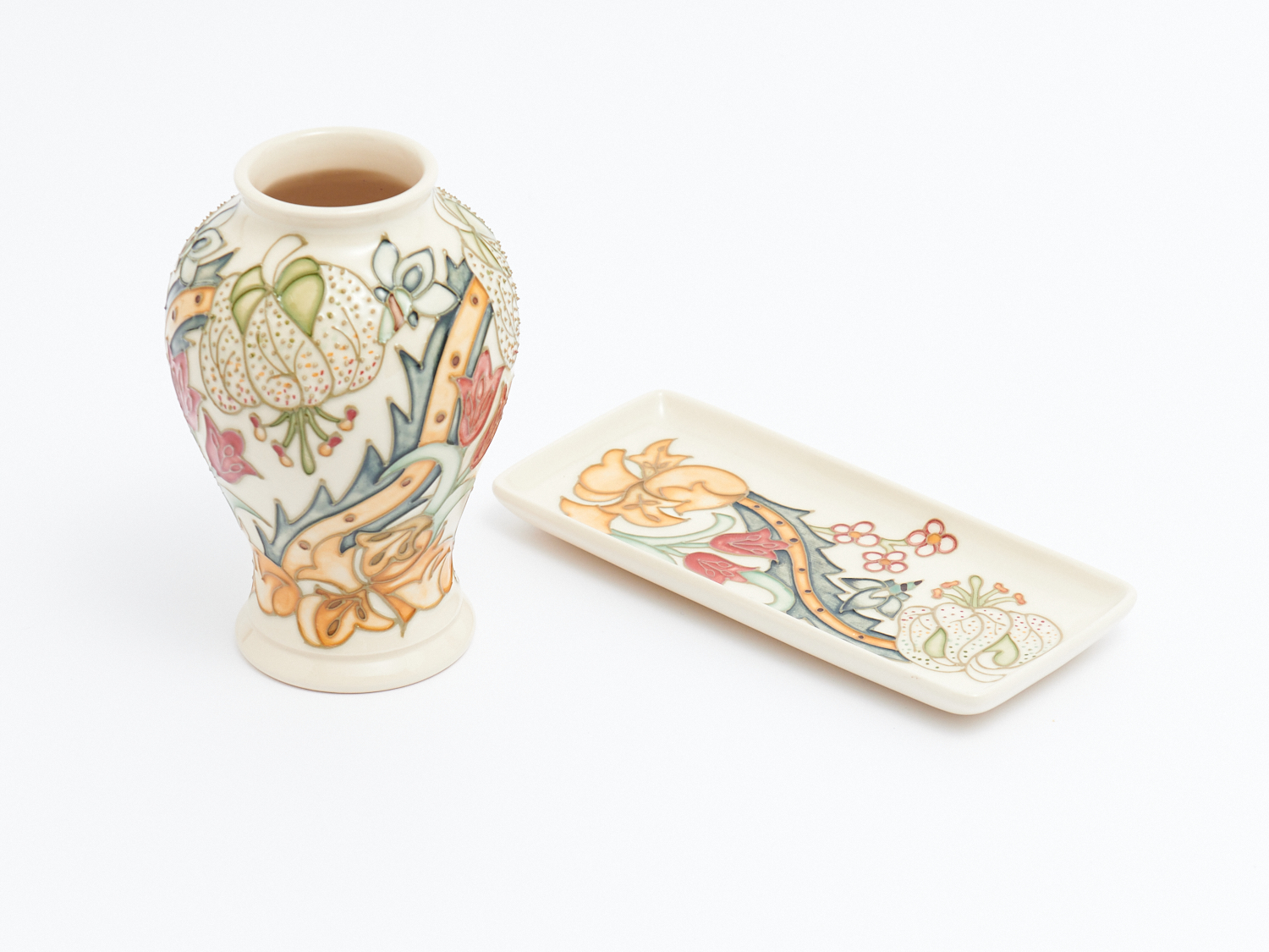 A MOORCROFT "GOLDEN IVORY" TRAY AND VASE, H.17CM AND W.20CM, LEONARD JOEL LOCAL DELIVERY: SMALL