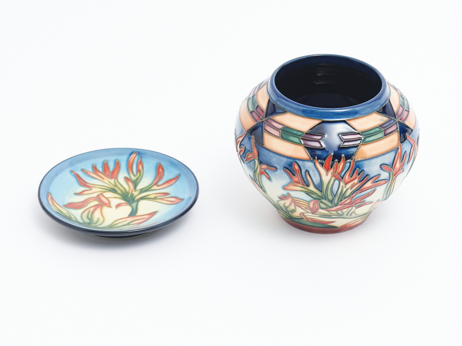 A MOORCROFT VASE AND PLATE, H.12CM AND DIA.11.5CM, LEONARD JOEL LOCAL DELIVERY: SMALL