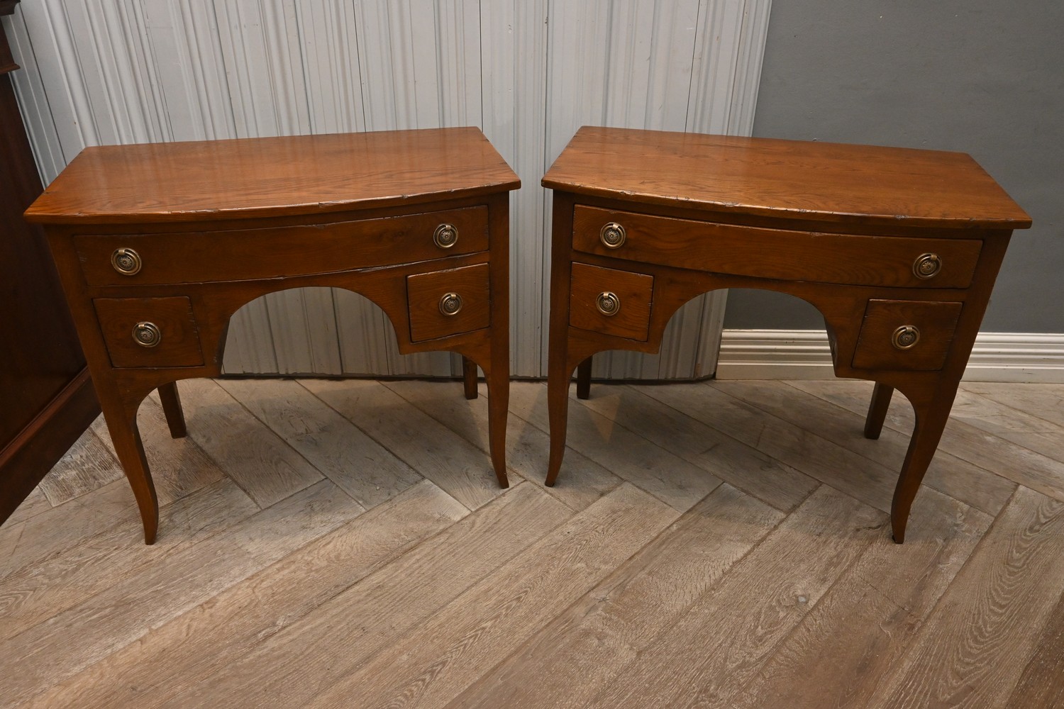 A PAIR OF GEORGE III-STYLE OAK BOW-FRONT BEDSIDE TABLES (67H X 75W X 43D CM) (LEONARD JOEL DELIVERY SIZE: X-LARGE)