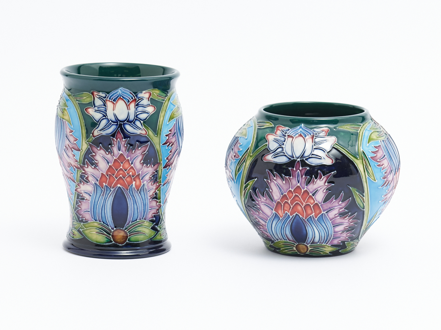 TWO MOORCROFT "SAADIAN" VASES DESIGNED BY SHIRLEY HAYES, 2001, H.14CM AND 11CM, LEONARD JOEL LOCAL DELIVERY: SMALL