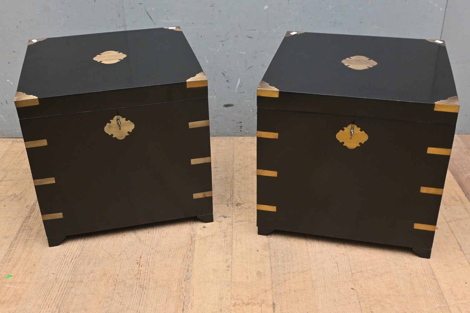 A PAIR OF EBONISED FLIP TOP TRUNKS WITH BRASS CORNERS AND CARRY HANDLES (KEYS IN OFFICE) ( 47H X 49W X 49D CM) (LEONARD JOEL DELIVERY SIZE: LARGE)