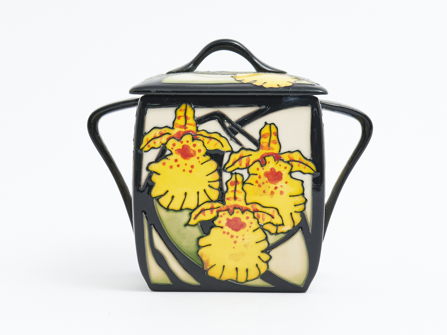 AN ART NOVEAU STYLE MOORCROFT DAFFODIL PATTERN BOX (A/F), DATED 2015 H.11CM, LEONARD JOEL LOCAL DELIVERY: SMALL