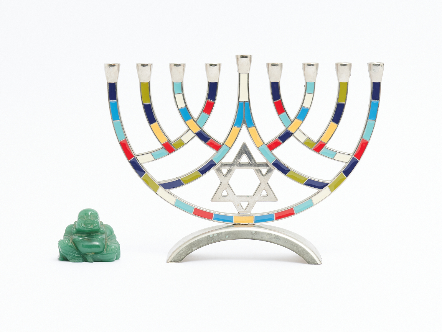 AN ENAMELLED METAL MENORAH AND CARVED HARDSTONE BUDDHA H.18CM (TALLEST), LEONARD JOEL LOCAL DELIVERY: SMALL