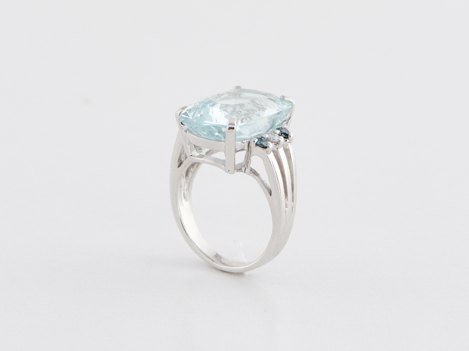 AN AQUAMARINE AND DIAMOND SET RING IN 18CT WHITE GOLD, THE AQUAMARINE WEIGHING 11.44CT, THE BLUE AND WHITE DIAMONDS TOTALLING 0.30CT, SIZE L