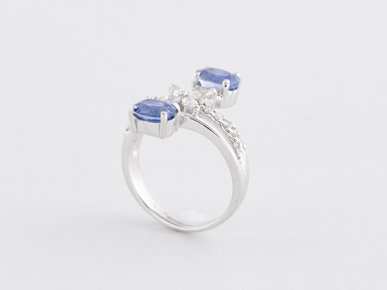 A CEYLON SAPPHIRE AND DIAMOND RING IN 18CT WHITE GOLD, THE SAPPHIRES TOTALLING APPROXIMATELY 2.74CTS, THE DIAMONDS TOTALLING APPROXIMATELY 0.38CTS, WITH VALUATION, RING SIZE M/N, WEIGHT 6.4GMS