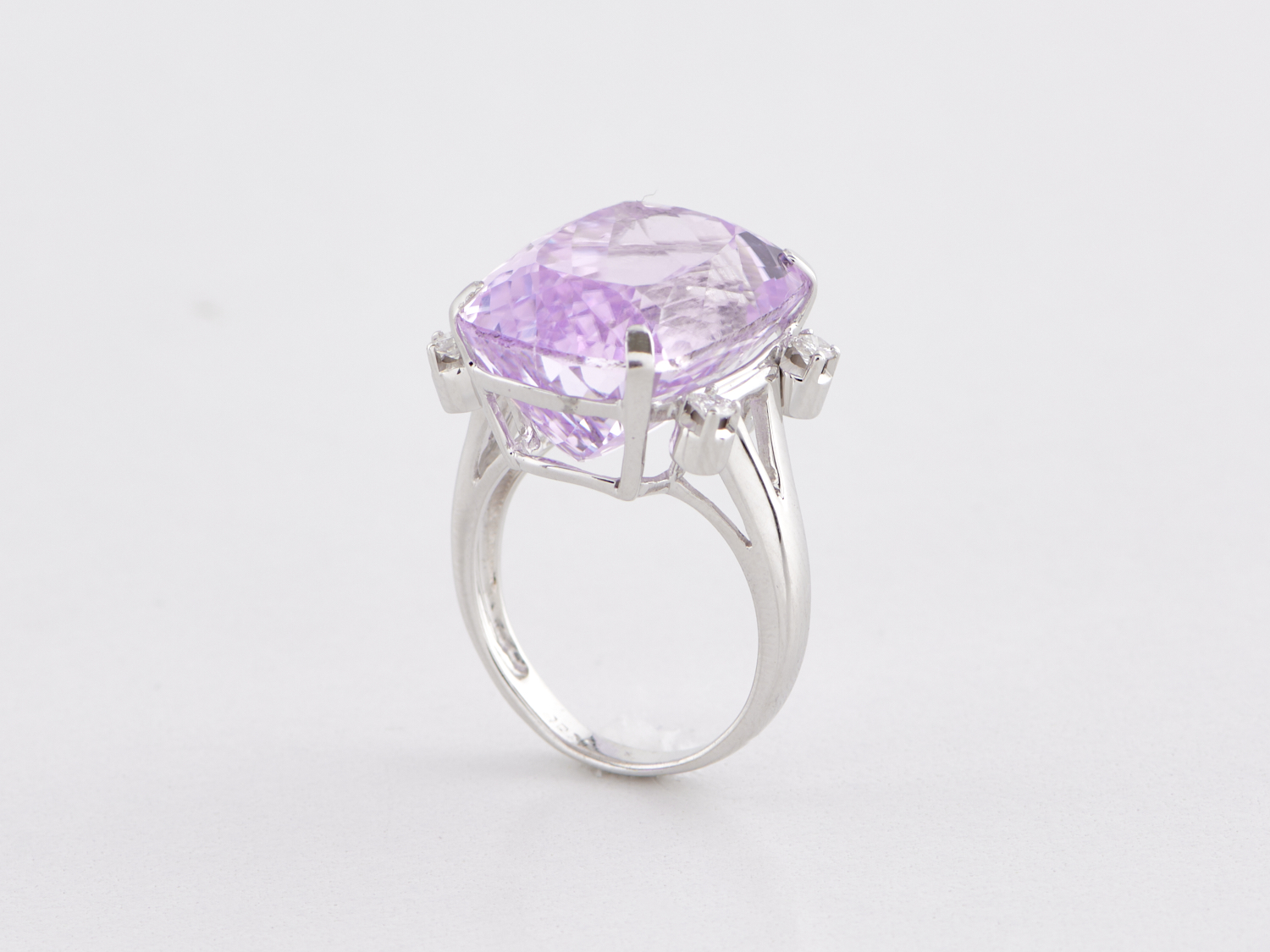 A KUNZITE AND DIAMOND SET RING IN 18CT WHITE GOLD, THE KUNZITE WEIGHING 25.20CT, THE DIAMONDS TOTALLING 0.16CT, SIZE N-O