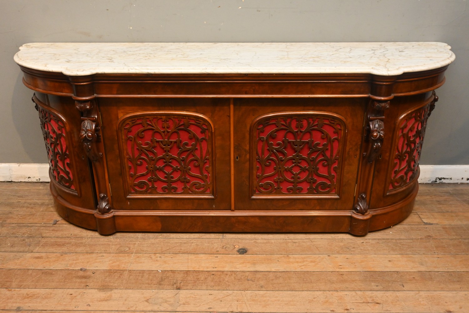 A VICTORIAN FIGURED WALNUT LOW CREDENZA WITH WHITE MARBLE TOP (A/F) (KEY IN OFFICE) (77H X 204W X 58D CM) (PLEASE NOTE THIS HEAVY ITEM MUST BE REMOVED BY CLIENTS OR CARRIERS AT THE CUSTOMERS EXPENSE. LEONARD JOEL STAFF CANNOT ASSIST CARRYING THIS ITEM)