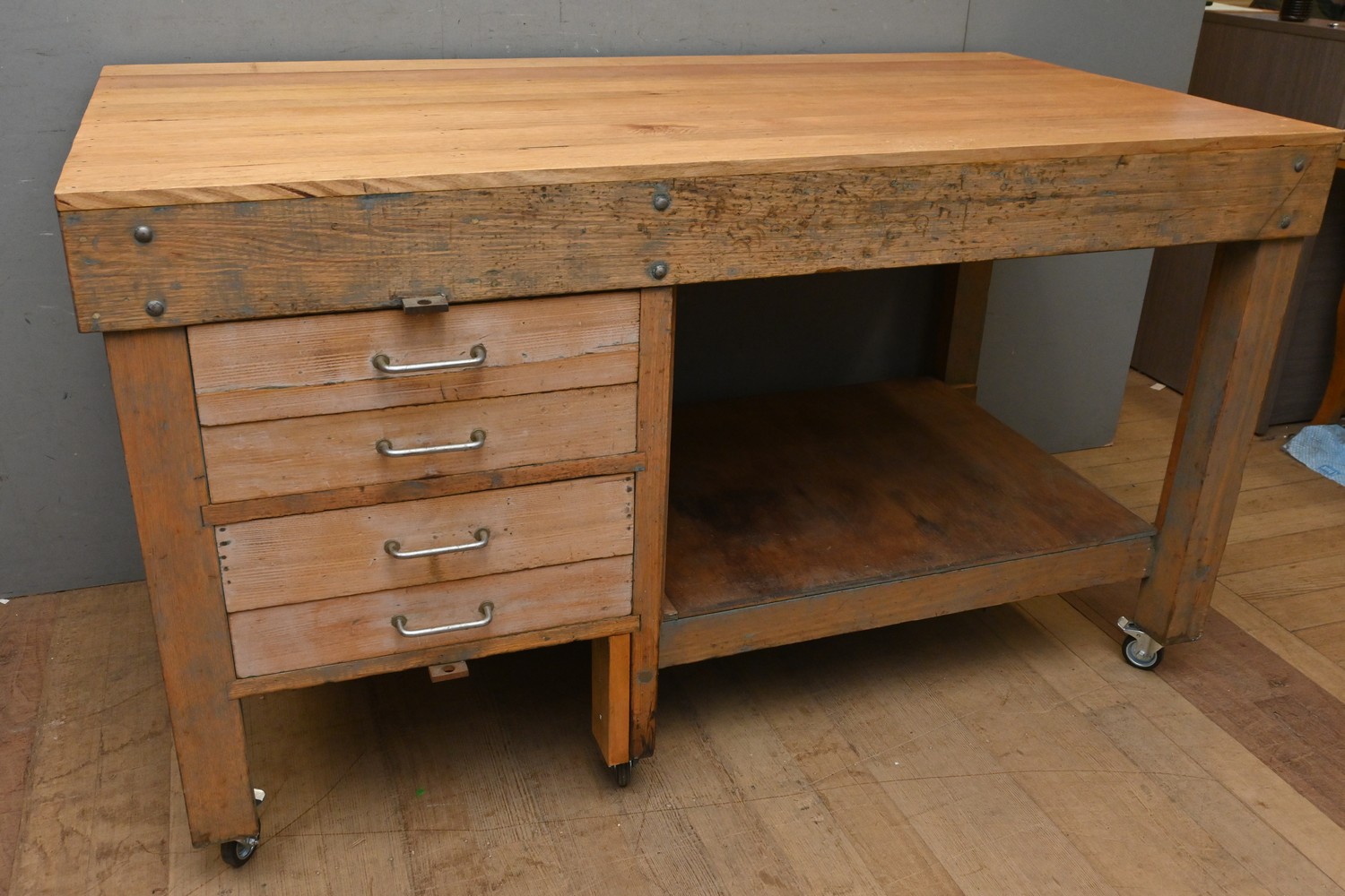 A 1950'S TASMANIAN OAK WORK BENCH ( 101H X 175W X 91D CM) (PLEASE NOTE THIS HEAVY ITEM MUST BE REMOVED BY CLIENTS OR CARRIERS AT THE CUSTOMERS EXPENSE. LEONARD JOEL STAFF CANNOT ASSIST CARRYING THIS ITEM)