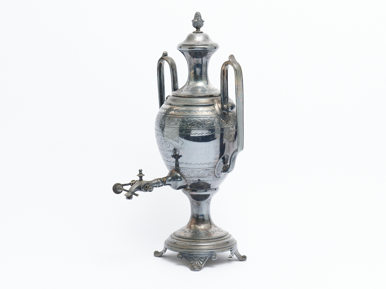 A SILVER PLATED TEA SAMOVAR WITH INSCRIPTION "RICHMOND CYCLING CLUB 20 MILE ROAD RACE" H.47.5CM, LEONARD JOEL LOCAL DELIVERY: MEDIUM