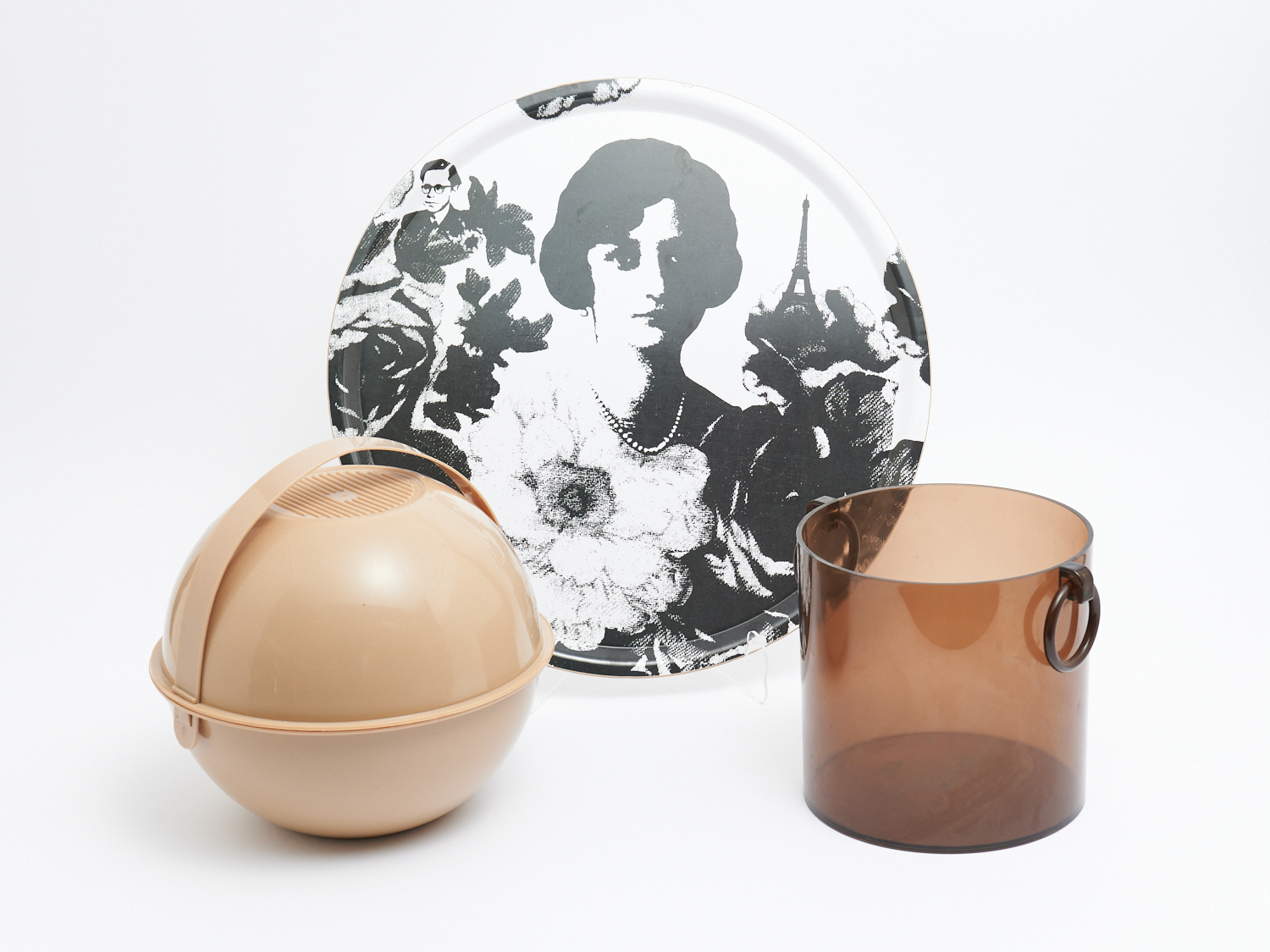 A GROUP OF ASSORTED ITEMS INCLUDING GUZZINI SPHERICAL PICNIC SET, BOURBON FRANCE ICEBUCKET AND SCANDINAVIAN MARIO TRAY DIA.45CM (LARGEST), LEONARD JOEL LOCAL DELIVERY: MEDIUM