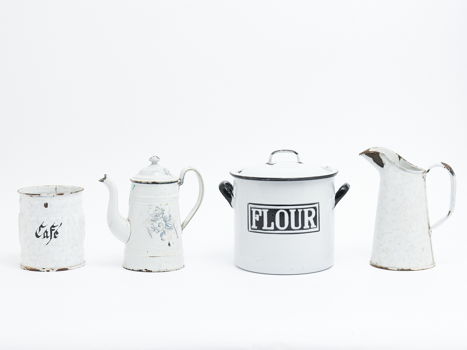 A GROUP OF FRENCH PROVINCIAL ENAMELLED KITCHENWARE H.23CM (TALLEST), LEONARD JOEL LOCAL DELIVERY: MEDIUM
