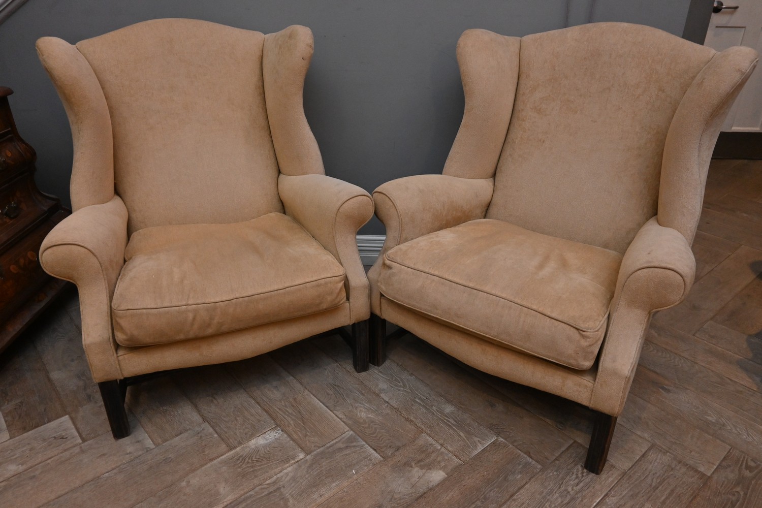 A PAIR OF UPHOLSTERED WINGBACK ARMCHAIRS (A/F) (103H X 93W X 93D CM) (LEONARD JOEL DELIVERY SIZE: X-LARGE)