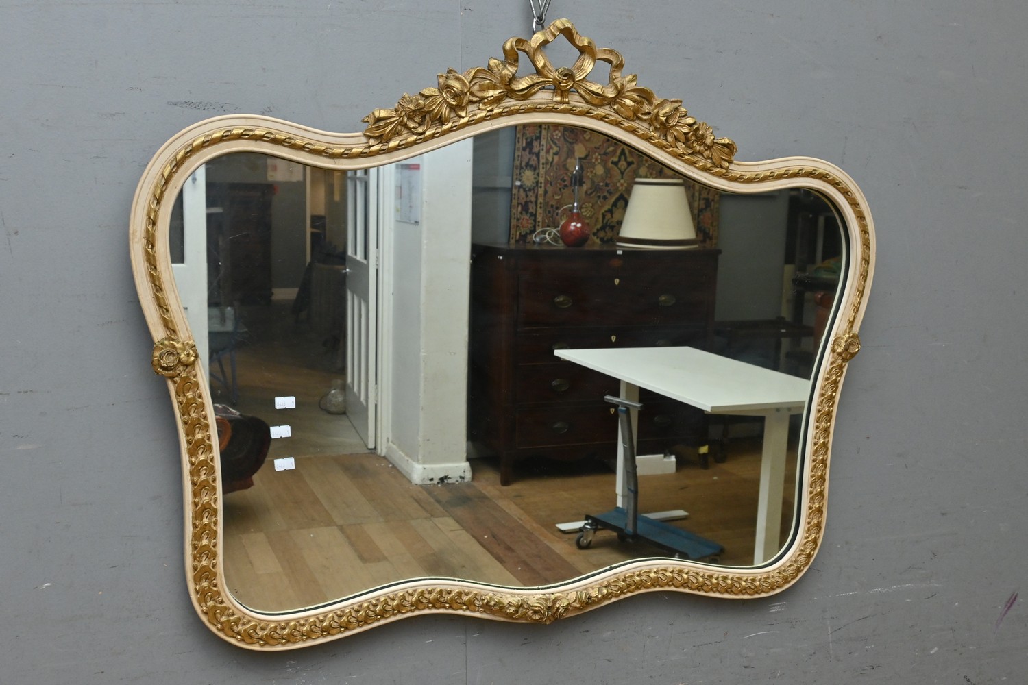 A SHAPED WALL MIRROR IN A PAINTED AND GILT FRAME ( 77H X 101W CM) (LEONARD JOEL DELIVERY SIZE: LARGE)