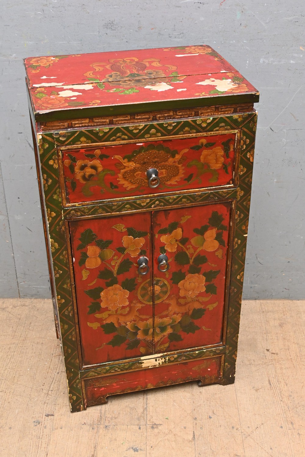 A CHINESE LACQUERED TWO DOOR BEDSIDE TABLE (A/F) (75H X 41W X 31D CM) (LEONARD JOEL DELIVERY SIZE: LARGE)