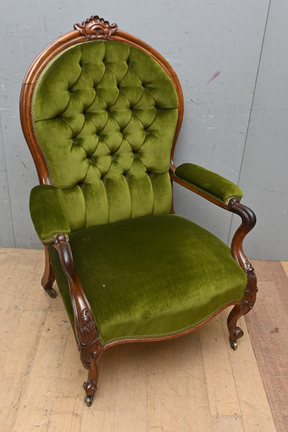 A VICTORIAN ROSEWOOD AND UPHOLSTERED ARMCHAIR IN GREEN VELVET (114H X 79W X 79D CM) (LEONARD JOEL DELIVERY SIZE: X-LARGE)